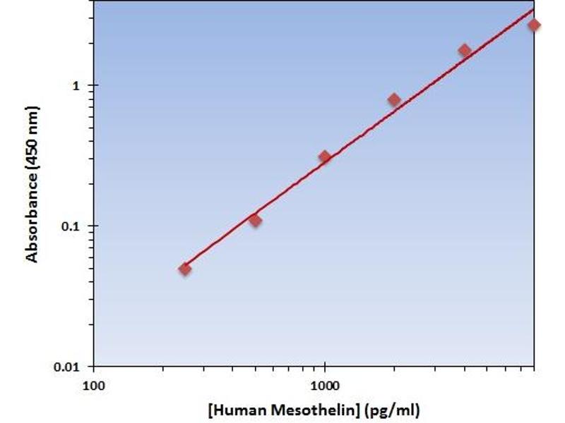 - The OmniKine? Human Mesothelin ELISA Kit contains the components necessary for quantitative determination of natural or recombinant Human Mesothelin concentrations within any experimental sample including cell lysates, serum and plasma. This particular immunoassay utilizes the quantitative technique of a "Sandwich" Enzyme- Linked Immunosorbent Assay (ELISA) where the target protein (antigen) is bound in a "sandwich" format by the primary capture antibodies coated to each well-bottom and the secondary detection antibodies added subsequently by the investigator. The capture antibodies coated to the bottom of each well are specific for a particular epitope on Human Mesothelin while the user-added detection antibodies bind to epitopes on the captured target protein. Amid each step of the procedure, a series of wash steps must be performed to ensure the elimination of non-specific binding between proteins to other proteins or to the solid phase. After incubation and "sandwiching" of the target antigen, a peroxidase enzyme is conjugated to the constant heavy chain of the secondary antibody (either covalently or via Avidin/Streptavidin-Biotin interactions), allowing for a colorimetric reaction to ensue upon substrate addition. When the substrate TMB (3, 3', 5, 5'-Tetramethylbenzidine) is added, the reaction catalyzed by peroxidase yields a blue color that is representative of the antigen concentration. Upon sufficient color development, the reaction can be terminated through addition of Stop Solution (2 N Sulfuric Acid) where the color of the solution will turn yellow. The absorbance of each well can then be read by a spectrophotometer, allowing for generation of a standard curve and subsequent determination of protein concentration.
