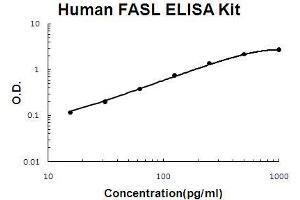 - human FASL ELISA Kit was based on standard sandwich enzyme-linked immune-sorbent assay technology. A monoclonal antibody from mouse specific for FASL has been precoated onto 96-well plates. Standards(CHO, P134-L281) and test samples are added to the wells, a biotinylated detection polyclonal antibody from goat specific for FASL is added subsequently and then followed by washing with PBS or TBS buffer. Avidin-Biotin-Peroxidase Complex was added and unbound conjugates were washed away with PBS or TBS buffer. HRP substrate TMB was used to visualize HRP enzymatic reaction. TMB was catalyzed by HRP to produce a blue color product that changed into yellow after adding acidic stop solution. The density of yellow is proportional to the human FASL amount of sample captured in plate.