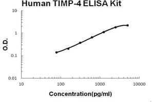 - human TIMP-4 ELISA Kit was based on standard sandwich enzyme-linked immune-sorbent assay technology. A monoclonal antibody from mouse specific for TIMP-4 has been precoated onto 96-well plates. Standards(sf21, C30-P224) and test samples are added to the wells, a biotinylated detection polyclonal antibody from goat specific for TIMP-4 is added subsequently and then followed by washing with PBS or TBS buffer. Avidin-Biotin-Peroxidase Complex was added and unbound conjugates were washed away with PBS or TBS buffer. HRP substrate TMB was used to visualize HRP enzymatic reaction. TMB was catalyzed by HRP to produce a blue color product that changed into yellow after adding acidic stop solution. The density of yellow is proportional to the human TIMP-4 amount of sample captured in plate.