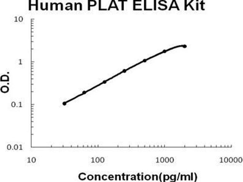 - human PLAT ELISA Kit was based on standard sandwich enzyme-linked immune-sorbent assay technology. A monoclonal antibody from mouse specific for PLAT has been precoated onto 96-well plates. Standards(CHO, M1-P562) and test samples are added to the wells, a biotinylated detection polyclonal antibody from goat specific for PLAT is added subsequently and then followed by washing with PBS or TBS buffer. Avidin-Biotin-Peroxidase Complex was added and unbound conjugates were washed away with PBS or TBS buffer. HRP substrate TMB was used to visualize HRP enzymatic reaction. TMB was catalyzed by HRP to produce a blue color product that changed into yellow after adding acidic stop solution. The density of yellow is proportional to the human PLAT amount of sample captured in plate.