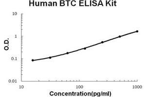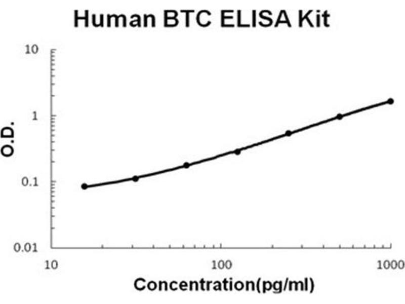 - human Betacellulin ELISA Kit was based on standard sandwich enzyme-linked immune-sorbent assay technology. A monoclonal antibody from mouse specific for Betacellulin has been precoated onto 96-well plates. Standards(E.coli, D32-Y111) and test samples are added to the wells, a biotinylated detection polyclonal antibody from goat specific for Betacellulin is added subsequently and then followed by washing with PBS or TBS buffer. Avidin-Biotin-Peroxidase Complex was added and unbound conjugates were washed away with PBS or TBS buffer. HRP substrate TMB was used to visualize HRP enzymatic reaction. TMB was catalyzed by HRP to produce a blue color product that changed into yellow after adding acidic stop solution. The density of yellow is proportional to the human Betacellulin amount of sample captured in plate.
