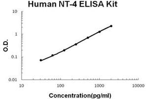 - human NT-4 ELISA Kit was based on standard sandwich enzyme-linked immune-sorbent assay technology. A monoclonal antibody from mouse specific for NT-4 has been precoated onto 96-well plates. Standards(sf21, G81-A210) and test samples are added to the wells, a biotinylated detection polyclonal antibody from goat specific for NT-4 is added subsequently and then followed by washing with PBS or TBS buffer. Avidin-Biotin-Peroxidase Complex was added and unbound conjugates were washed away with PBS or TBS buffer. HRP substrate TMB was used to visualize HRP enzymatic reaction. TMB was catalyzed by HRP to produce a blue color product that changed into yellow after adding acidic stop solution. The density of yellow is proportional to the human NT-4 amount of sample captured in plate.