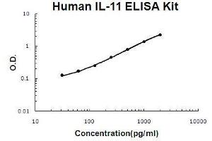 - human IL-11 ELISA Kit was based on standard sandwich enzyme-linked immune-sorbent assay technology. A monoclonal antibody from mouse specific for IL-11 has been precoated onto 96-well plates. Standards(E.coli, P22-L199) and test samples are added to the wells, a biotinylated detection polyclonal antibody from goat specific for IL-11 is added subsequently and then followed by washing with PBS or TBS buffer. Avidin-Biotin-Peroxidase Complex was added and unbound conjugates were washed away with PBS or TBS buffer. HRP substrate TMB was used to visualize HRP enzymatic reaction. TMB was catalyzed by HRP to produce a blue color product that changed into yellow after adding acidic stop solution. The density of yellow is proportional to the human IL-11 amount of sample captured in plate.