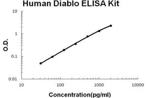 - human Diablo ELISA Kit was based on standard sandwich enzyme-linked immune-sorbent assay technology. A monoclonal antibody from mouse specific for Diablo has been precoated onto 96-well plates. Standards(E.coli, A56-D239) and test samples are added to the wells, a biotinylated detection polyclonal antibody from goat specific for Diablo is added subsequently and then followed by washing with PBS or TBS buffer. Avidin-Biotin-Peroxidase Complex was added and unbound conjugates were washed away with PBS or TBS buffer. HRP substrate TMB was used to visualize HRP enzymatic reaction. TMB was catalyzed by HRP to produce a blue color product that changed into yellow after adding acidic stop solution. The density of yellow is proportional to the human Diablo amount of sample captured in plate.