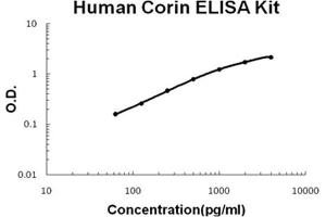 - human Corin ELISA Kit was based on standard sandwich enzyme-linked immune-sorbent assay technology. A monoclonal antibody from mouse specific for Corin has been precoated onto 96-well plates. Standards(NSO, S67-N1042) and test samples are added to the wells, a biotinylated detection polyclonal antibody from goat specific for Corin is added subsequently and then followed by washing with PBS or TBS buffer. Avidin-Biotin-Peroxidase Complex was added and unbound conjugates were washed away with PBS or TBS buffer. HRP substrate TMB was used to visualize HRP enzymatic reaction. TMB was catalyzed by HRP to produce a blue color product that changed into yellow after adding acidic stop solution. The density of yellow is proportional to the human Corin amount of sample captured in plate.