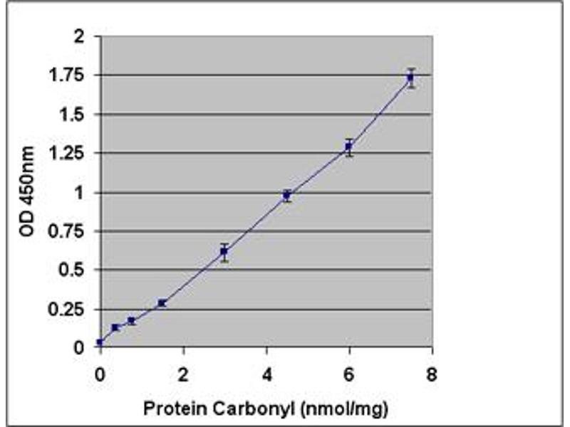 OxiSelect™ Protein Carbonyl ELISA Kit, protein samples are first allowed to adsorb to wells of a 96-well plate and then react with DNPH. There is no need to concentrate protein in experimental and clinical samples with low amounts of protein (< 4 mg/mL) and the kit requires protein sample as little as 10 μg/mL. The OxiSelect™ Protein Carbonyl ELISA Kit is an enzyme immunoassay developed for rapid detection and quantitation of protein carbonyls. The quantity of protein carbonyls in protein sample is determined by comparing its absorbance with that of a known reduced/oxidized BSA standard curve. Each kit provides sufficient reagents to perform up to 96 assays, including standard curve and unknown protein samples.
