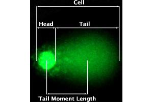 The DNA damage is quantified by measuring the displacement between the genetic material of the nucleus ('comet head') and the resulting 'tail'. Tail Moment and Tail DNA% are the two most common parameters to analyze Comet assay results. At least 50 -100 cells should be analyzed per sample. The Tail Moment has been suggested to be an appropriate index of induced DNA damage in considering both the migration of the genetic material as well as the relative amount of DNA in the tail. Tail DNA% = 100 x Tail DNA Intensity/Cell DNA Intensity Tail Moment can be measured using one of the following methods: (a) Olive Tail Moment = Tail DNA% x Tail Moment Length (b) Extent Tail Moment = Tail DNA% x Length of Tail (see Figure 3) A number of Comet Assay analysis software programs are commercially available, such as Comet Assay IV (Perceptive Instruments) and CASPlab. Tail Moment Length is measured from the center of the head to the center of the tail (see Figure 3) Figure 3: Typical Damaged DNA in Comet Assay. 8