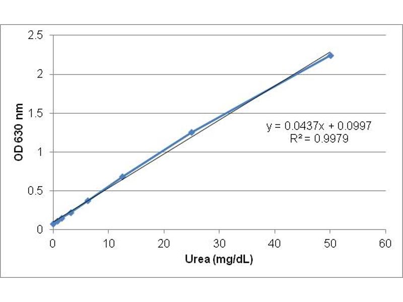 - Urea Assay Kit measures urea levels within urine, serum, plasma, cell lysates, or tissue homogenates. Samples are compared to a known concentration of urea standard within a 96-well microtiter plate format. Samples and standards are incubated for 10 minutes with the enzyme urease, which hydrolyzes urea to ammonia and CO2. The ammonia reacts further with a chromogen in alkali solution to produce a blue-green colored product. After 30 minutes, the plate is read with a standard 96-well spectrophotometric microplate reader at an optical density between 580 nm and 630 nm . Higher OD values correlate with high urea concentrations. Sample urea concentrations are determined by comparison with the known urea standards. The standard curve is linear up to 50 mg/dL urea.