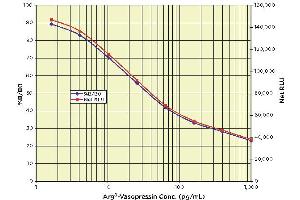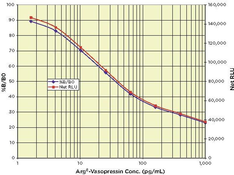 Or use the online tool from http://www.myassays.com/arbor-assays-arg8-vasopressin-clia-kit.assay to calculate the data. *The MyAssays logo is a registered trademark of MyAssays Ltd. typical data Sample Mean RLU NetRLU % B/B0 AVP Conc. (pg/mL) NSB 10,445 0 - - Standard 1 48,115 37,670 22.88 1,000 Standard 2 56,605 46,160 28.03 400 Standard 3 65,020 54,575 33.14 160 Standard 4 79,215 68,770 41.76 64 Standard 5 102,215 91,770 55.73 25.6 Standard 6 125,960 115,515 70.15 10.24 Standard 7 146,890 136,445 82.86 4.096 Standard 8 157,205 146,760 89.13 1.638 B0 175,105 164,660 100.0 0 Sample 1 90,840 80,395 48.82 40.30 Sample 2 120,995 110,550 67.14 12.62 Always run your own standard curve for calculation of results.
