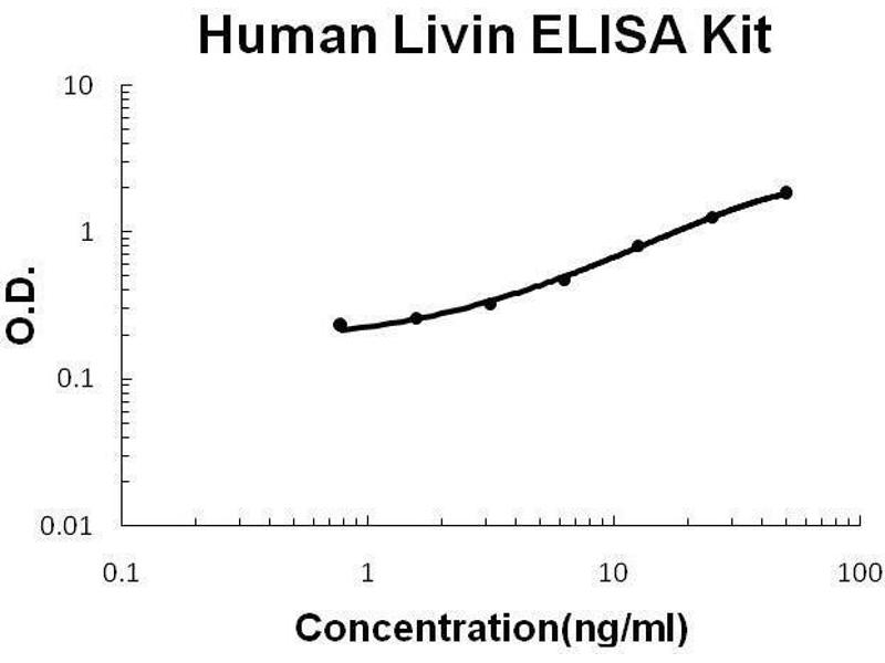 - human Livin ELISA Kit was based on standard sandwich enzyme-linked immune-sorbent assay technology. A monoclonal antibody from mouse specific for Livin has been precoated onto 96-well plates. Standards(E.coli, M1-S298) and test samples are added to the wells, a biotinylated detection polyclonal antibody from goat specific for Livin is added subsequently and then followed by washing with PBS or TBS buffer. Avidin-Biotin-Peroxidase Complex was added and unbound conjugates were washed away with PBS or TBS buffer. HRP substrate TMB was used to visualize HRP enzymatic reaction. TMB was catalyzed by HRP to produce a blue color product that changed into yellow after adding acidic stop solution. The density of yellow is proportional to the human Livin amount of sample captured in plate.