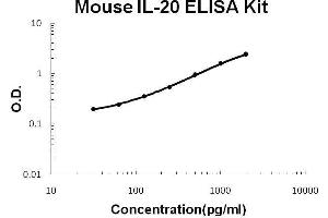 - mouse IL-20 ELISA Kit was based on standard sandwich enzyme-linked immune-sorbent assay technology. A monoclonal antibody from rat specific for IL-20 has been precoated onto 96-well plates. Standards(E.coli, L25-E176) and test samples are added to the wells, a biotinylated detection polyclonal antibody from goat specific for IL-20 is added subsequently and then followed by washing with PBS or TBS buffer. Avidin-Biotin-Peroxidase Complex was added and unbound conjugates were washed away with PBS or TBS buffer. HRP substrate TMB was used to visualize HRP enzymatic reaction. TMB was catalyzed by HRP to produce a blue color product that changed into yellow after adding acidic stop solution. The density of yellow is proportional to the mouse IL-20 amount of sample captured in plate.