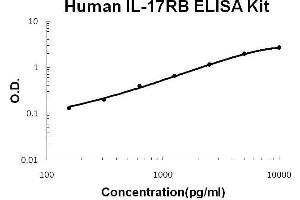 - human IL-17RB ELISA Kit was based on standard sandwich enzyme-linked immune-sorbent assay technology. A monoclonal antibody from mouse specific for IL-17RB has been precoated onto 96-well plates. Standards(NSO, R18-K286) and test samples are added to the wells, a biotinylated detection polyclonal antibody from goat specific for IL-17RB is added subsequently and then followed by washing with PBS or TBS buffer. Avidin-Biotin-Peroxidase Complex was added and unbound conjugates were washed away with PBS or TBS buffer. HRP substrate TMB was used to visualize HRP enzymatic reaction. TMB was catalyzed by HRP to produce a blue color product that changed into yellow after adding acidic stop solution. The density of yellow is proportional to the human IL-17RB amount of sample captured in plate.