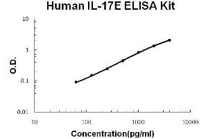 - human IL-17E ELISA Kit was based on standard sandwich enzyme-linked immune-sorbent assay technology. A monoclonal antibody from mouse specific for IL-17E has been precoated onto 96-well plates. Standards(E.coli, Y33-G177) and test samples are added to the wells, a biotinylated detection polyclonal antibody from goat specific for IL-17E is added subsequently and then followed by washing with PBS or TBS buffer. Avidin-Biotin-Peroxidase Complex was added and unbound conjugates were washed away with PBS or TBS buffer. HRP substrate TMB was used to visualize HRP enzymatic reaction. TMB was catalyzed by HRP to produce a blue color product that changed into yellow after adding acidic stop solution. The density of yellow is proportional to the human IL-17E amount of sample captured in plate.