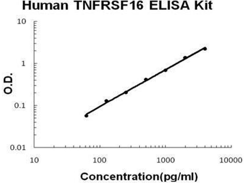 - human TNFRSF16 ELISA Kit was based on standard sandwich enzyme-linked immune-sorbent assay technology. A monoclonal antibody from mouse specific for TNFRSF16 has been precoated onto 96-well plates. Standards (sf21, K29 - N250) and test samples are added to the wells, a biotinylated detection polyclonal antibody from goat specific for TNFRSF16 is added subsequently and then followed by washing with PBS or TBS buffer. Avidin-Biotin-Peroxidase Complex was added and unbound conjugates were washed away with PBS or TBS buffer. HRP substrate TMB was used to visualize HRP enzymatic reaction. TMB was catalyzed by HRP to produce a blue color product that changed into yellow after adding acidic stop solution. The density of yellow is proportional to the human TNFRSF16 amount of sample captured in plate.