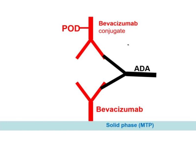 - The Antibody to Bevacizumab ELISA is a sandwich type ELISA for the determination of free antibodies against Bevacizumab in serum and plasma samples. During the first incubation period, the drug Bevacizumab, coated on the wall of the microtiter wells, captures the antibodies to Bevacizumab in patient serum and plasma samples. After washing away the unbound components from samples, a Peroxidase-labelled Bevacizumab conjugate is added to each well and then incubated. Antibody to Bevacizumab, if present in sample, will make a bridge, with its two identical Fab arms, between the Bevacizumab coated on the well and the other Bevacizumab labeled with peroxidase. After a second washing step, the bound enzymatic activity is detected by addition of tetramethylbenzidine (TMB) chromogen-substrate. Finally, the reaction is terminated with an acidic stop solution. The intensity of the reaction color is related to the presence of antibodies to Bevacizumab in the sample.
