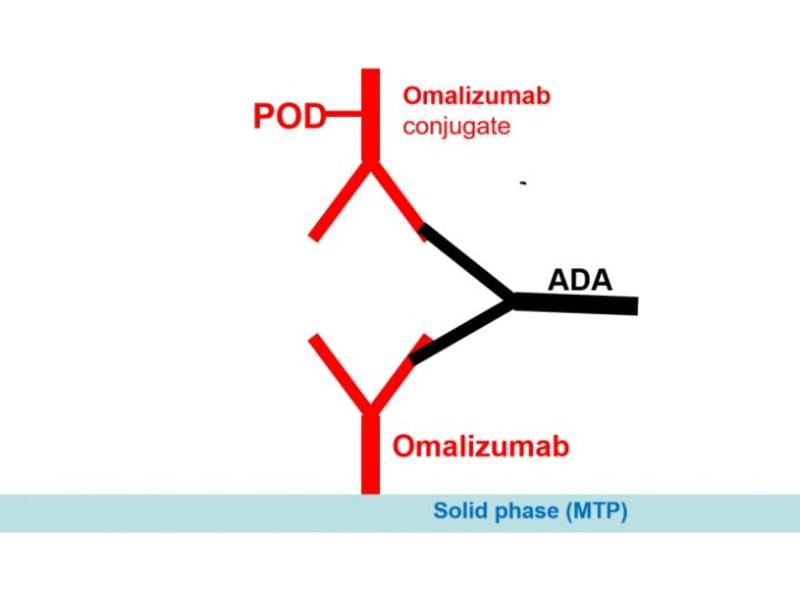 - The Antibody to Omalizumab ELISA is a sandwich type ELISA for the determination of free antibodies against Omalizumab in serum and plasma samples. During the first incubation period, antibodies to Omalizumab in patient serum/plasma samples are captured by the drug Omalizumab coated on the wall of the microtiter wells. After washing away the unbound components from samples, a peroxidase-labelled Omalizumab conjugate is added and then incubated. Antibody to Omalizumab, if present in sample, will make a bridge, with its two identical Fab arms, between the Omalizumab coated on the well and the other Omalizumab labeled with peroxidase. After a second washing step, the bound enzymatic activity is detected by addition of tetramethylbenzidine (TMB) chromogen-substrate. Finally, the reaction is terminated with stop solution. The positive reaction is related to the presence of antibodies to Omalizumab in the sample.