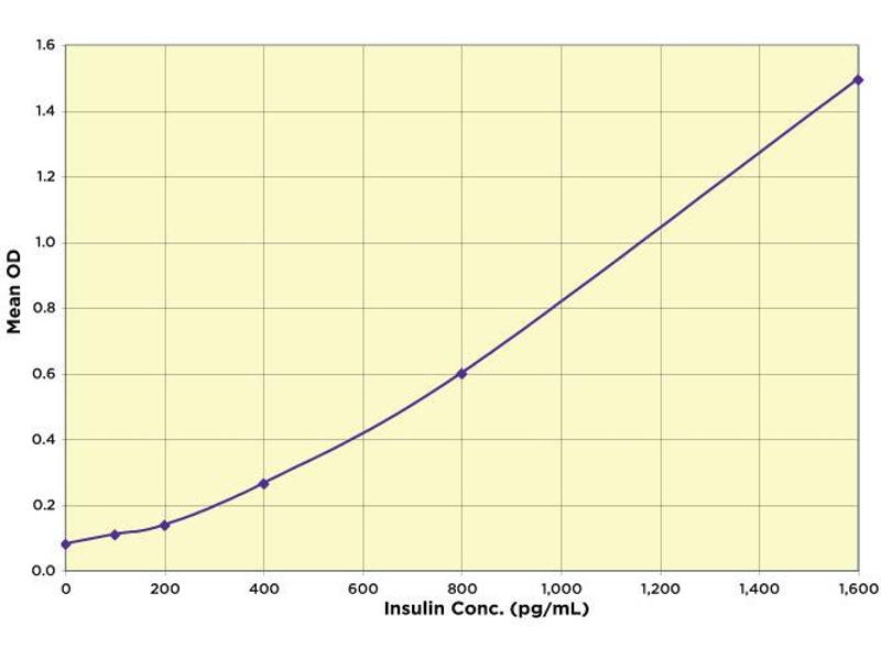 tyPical data Sample Mean OD Insulin Conc. (pg/mL) Standard 1 1.493 1,600 Standard 2 0.600 800 Standard 3 0.264 400 Standard 4 0.138 200 Standard 5 0.110 100 Zero 0.081 0 Sample 1 0.466 655.0 Sample 2 0.227 346.6 Always run your own standard curve for calculation of results.