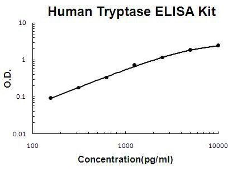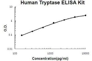 - human Tryptase ELISA Kit was based on standard sandwich enzyme-linked immune-sorbent assay technology. A monoclonal antibody from mouse specific for Tryptase has been precoated onto 96-well plates. Standards(Expression system for standard: NSO, Immunogen sequence: M1-V275) and test samples are added to the wells, a biotinylated detection polyclonal antibody from goat specific for Tryptase is added subsequently and then followed by washing with PBS or TBS buffer. Avidin-Biotin-Peroxidase Complex was added and unbound conjugates were washed away with PBS or TBS buffer. HRP substrate TMB was used to visualize HRP enzymatic reaction. TMB was catalyzed by HRP to produce a blue color product that changed into yellow after adding acidic stop solution. The density of yellow is proportional to the human Tryptase amount of sample captured in plate.