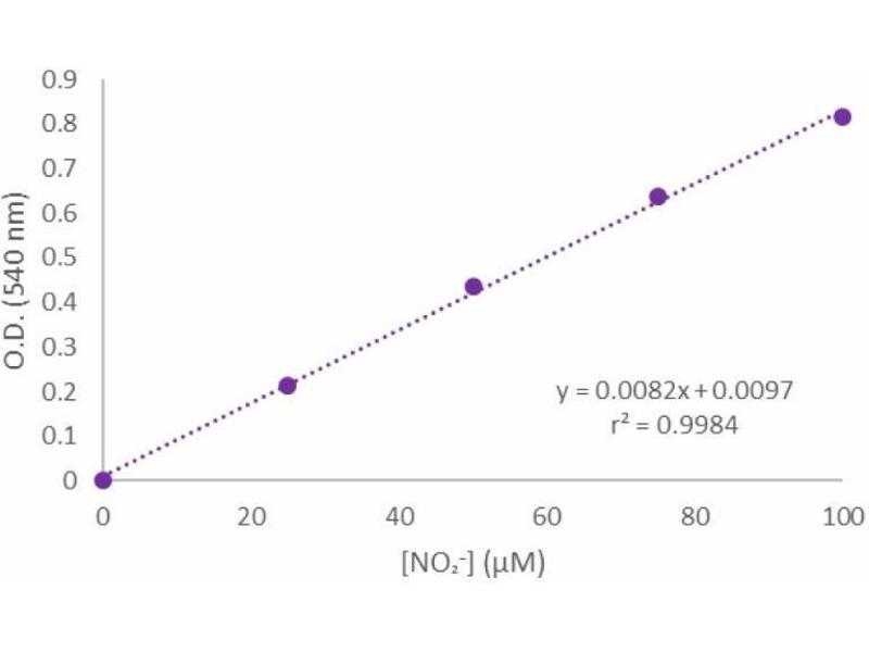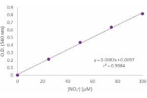 Determine average absorbance value of each experimental sample. Determine its concentration by comparison to the Nitrite Standard reference curve (Figure 2 see images). Nitrite (μM) = (?A540nm- intercept)/ slope