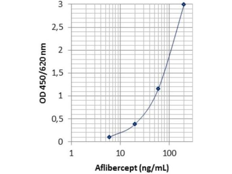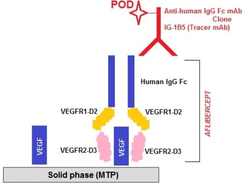 The Aflibercept ELISA is a sandwich type ELISA. Standards and diluted samples are incubated in the microtitre plate coated with recombinant human vascular endothelial growth factor-A (rhVEGF-A). After incubation, the wells are washed. A horseradish peroxidase (HRP)-conjugated anti-human IgG monoclonal antibody is added and binds to the Fc part of Aflibercept. Following incubation, the wells are washed and the bound enzymatic activity is detected by addition of chromogen-substrate. The colour developed is proportional to the amount of Aflibercept in the sample or standard. Results of samples can be determined by using the standard curve.