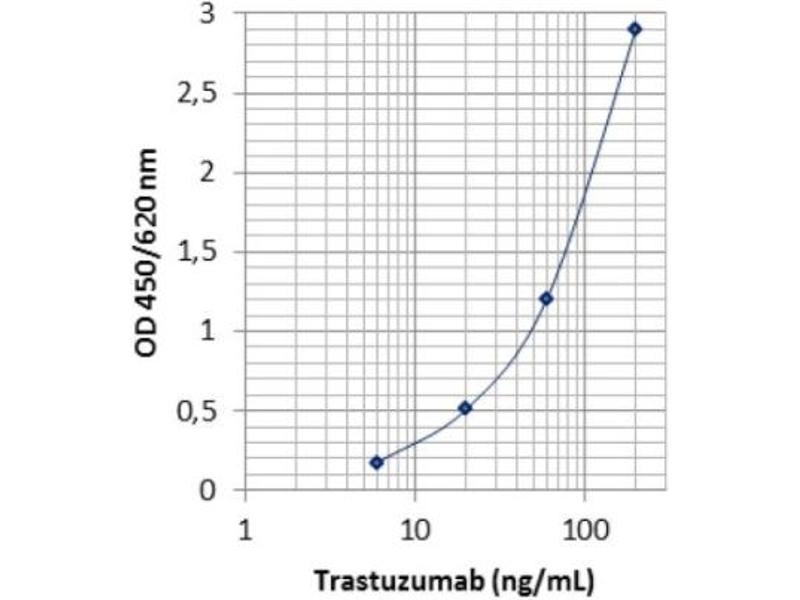 - There is no cross reaction with any other proteins present in native human serum. A screening test was performed with 48 different native human sera. All produced OD450/620 nm values (ranged from 0.028 to 0.136) less than the mean OD (0.214) of standard D (10 ng/mL). In addition, binding of Trastuzumab is inhibited by recombinant human HER2 in a concentration dependent manner. Therefore, the Trastuzumab ELISA (mAb-Based) measures the biologically active free form of Trastuzumab, i.e. not pre-occuppied by HER2. No cross reaction was observed with sera spiked with the other therapeutic antibodies including Infliximab, Adalimumab, Etanercept, Rituximab, Tocillizumab, Omalizumab and Bevacizumab at concentrations up to 2 mg/mL. All produced mean OD450/620 nm values ranged from 0.013 to 0. 019.