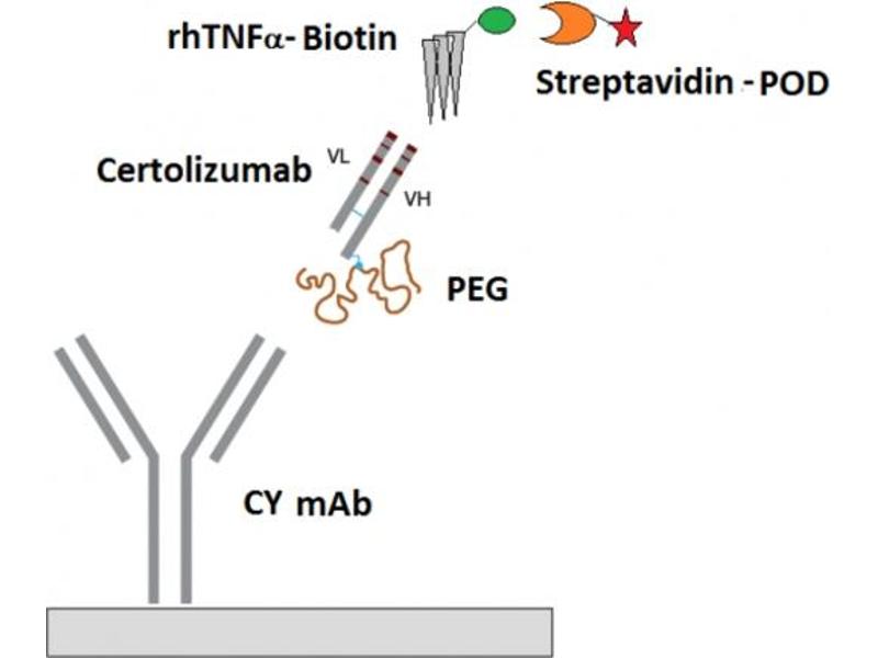 - This ELISA is based on Certolizumab pegol-specific mouse monoclonal antibody (catcher Ab, clone CY). Standards and diluted samples are incubated in the microtiter plate coated with IG-CY mAb. After incubation, the wells are washed. A biotinylated recombinant human tumor necrosis factor alpha (rhTNFα) is added and binds to the Fab part of Certolizumab pegol. Following incubation, wells are washed and the horseradish peroxidase (HRP)-conjugated streptavidin is added and binds to the biotinylated rhTNFα. Following incubation, wells are washed and the bound enzymatic activity is detected by addition of chromogen-substrate. The colour developed is proportional to the amount of Certolizumab pegol in the sample or standard. Results of samples can be determined by using the standard curve. Preincubation of Certolizumab pegol with rhTNFα inhibited the reaction in a concentration dependent manner. Therefore, the Certolizumab pegol ELISA (mAb-based) measures the free form of Certolizumab pegol.