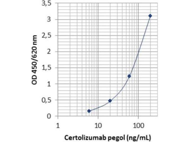 - There is no cross reaction with any other proteins present in native human serum. A screening test was performed with 48 different native human sera at a dilution of 1:500. All produced OD450/620 nm values (ranged from 0.018 to 0.022) less than the mean OD (0.151) of the diluted standard D (6 ng/mL). In addition, binding of Certolizumab pegol is inhibited by recombinant human tumor necrosis factor alpha (rhTNFα) in a concentration dependent manner. Therefore, the ImmunoGuide Certolizumab pegol ELISA (mAb-based) measures the biologically active free form of Certolizumab pegol, i.e. not pre-occuppied by TNFα. No cross reaction was observed with sera spiked with the other therapeutic antibodies including Infliximab, Etanercept, Adalimumab, Golimumab, Remsima, Tocillizumab, Trastuzumab and Rituximab tested at concentration of 100 µg/mL. All produced mean OD450/620 nm values less than 0.040.