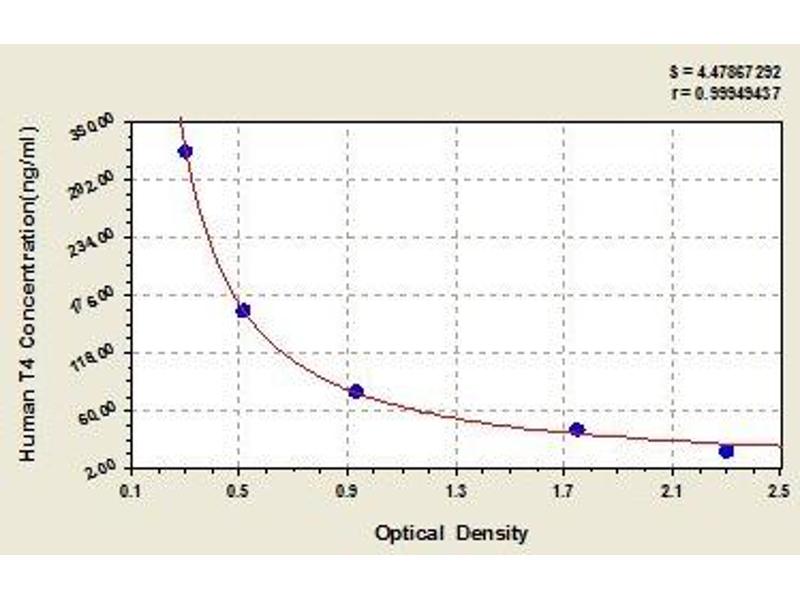Create a standard curve by reducing the data using computer software capable of generating a four parameter logistic (4-PL) curve fit. As an alternative, construct a standard curve by plotting the mean absorbance for each standard on the x-axis against the concentration on the y-axis and draw a best fit curve through the points on the graph. The data may be linearized by plotting the log of the target antigen concentration versus the log of the O.D. and the best fit line can be determined by regression analysis. This procedure will produce an adequate but less precise fit of the data.