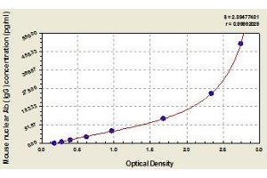 - The microtiter plate provided in this kit has been pre-coated with anti-mouse IgG antibody. Standards or samples are then added to the appropriate microtiter plate wells with a biotin-conjugated antigen and Avidin conjugated to Horseradish Peroxidase (HRP) is added to each microplate well and incubated. Then a TMB (3,3',5,5' tetramethyl-benzidine) substrate solution is added to each well. The enzyme-substrate reaction is terminated by the addition of a sulphuric acid solution and the color change is measured spectrophotometrically at a wavelength of 450 nm ± 2 nm. The concentration of anti-nuclear antibody(IgG) in the samples is then determined by comparing the O.D. of the samples to the standard curve.