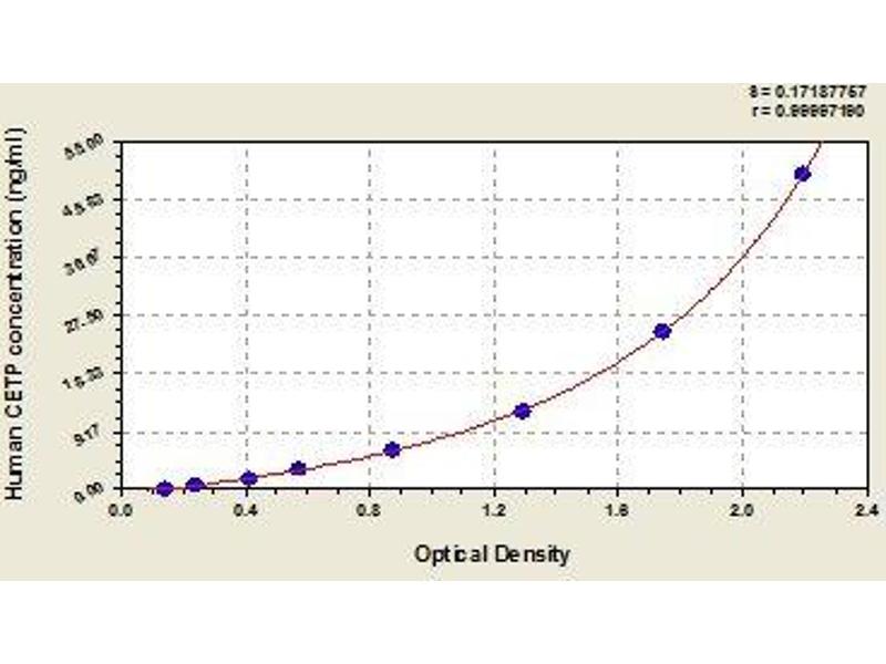 - Antibody specific for CETP has been pre-coated onto a microplate. Standards and samples are pipetted into the wells and any CETP present is bound by the immobilized antibody. After removing any unbound substances, a biotin-conjugated antibody specific for CETP is added to the wells. After washing, avidin conjugated Horseradish Peroxidase (HRP) is added to the wells. Following a wash to remove any unbound avidin-enzyme reagent, a substrate solution is added to the wells and color develops in proportion to the amount of CETP bound in the initial step. The color development is stopped and the intensity of the color is measured.