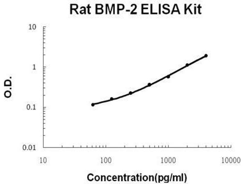 Background: Bone morphogenetic protein-2(BMP-2, BMP 2A) belongs to the transforming growth factor beta(TGF-beta) superfamily. It is thought to be involved in cartilage and bone formation during embryogenesis, but may have additional functions in morphogenesis as implied by its expression in various organs and embryonic tissues of mice. BMP-2 has been identified as a candidate mediator of retinoid activity. BMP-2 protein induces medulloblastoma cell apoptosis, whereas the BMP-2 antagonist noggin blocks both retinoid and BMP-2-induced apoptosis. BMP-2 also induces p38 mitogen-activated protein kinase(MAPK), which is necessary for BMP-2 and retinoid-induced apoptosis. Bone morphogenic proteins(BMPs) are known to promote osteogenesis, and clinical trials are currently underway to evaluate the ability of certain BMPs to promote fracture-healing and spinal fusion. The standard product used in this kit is recombinant rat BMP-2, constituting dimer by two chains of 114 amino acids with the molecular mass of 26KDa.