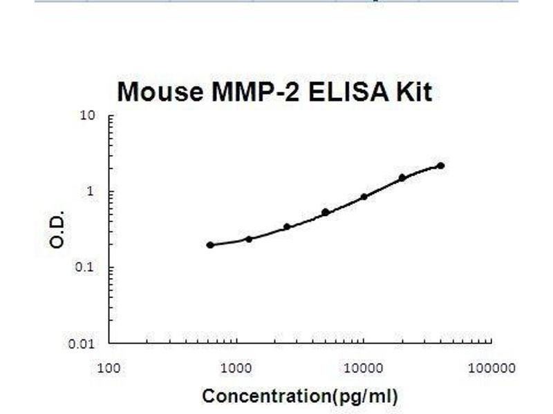 Background: Type IV collagenase, 72-kD, is officially designated matrix metalloproteinase-2(MMP2). It is also known as gelatinase, 72-kD. MMP-2 plays an essential role in angiogenesis and arteriogenesis, two processes critical to restoration of tissue perfusion after ischemia. MMP-2 expression is increased in tissue ischemia, but the responsible mechanisms remain unknown. Matrix metalloproteinases(MMPs) catalyze extracellular matrix degradation. Control of their activity is a promising target for therapy of diseases characterized by abnormal connective tissue turnover. MMPs are expressed as latent proenzymes that are activated by proteolytic cleavage that triggers a conformational change in the propeptide(cysteine switch). The structure of proMMP-2 reveals how the propeptide shields the catalytic cleft and that the cysteine switch may operate through cleavage of loops essential for propeptide stability. The gene is localized to 16q21 using somatic cell hybrids and in situ hybridization. The standard product used in this kit is recombinant mouse MMP-2, consisting of 662 amino acids with the molecular mass of 72KDa. The detected MMP-2 includes zymogen and active enzyme.