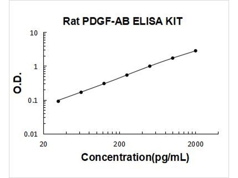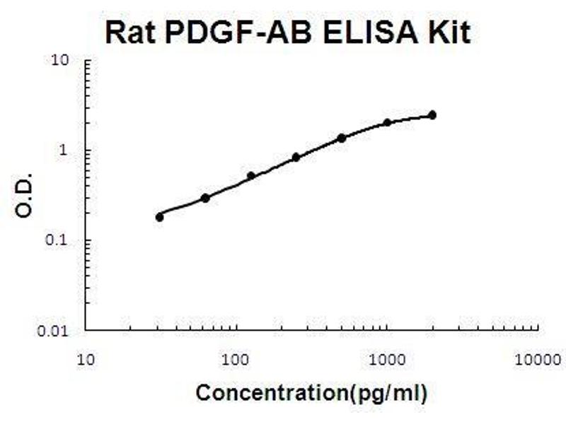 - rat PDGF-AB ELISA Kit was based on standard sandwich enzyme-linked immune-sorbent assay technology. A monoclonal antibody from mouse specific for PDGF-AB has been precoated onto 96-well plates. Standards(E.coli, (R86-K204)+(S74-T182)) and test samples are added to the wells, a biotinylated detection polyclonal antibody from goat specific for PDGF-AB is added subsequently and then followed by washing with PBS or TBS buffer. Avidin-Biotin-Peroxidase Complex was added and unbound conjugates were washed away with PBS or TBS buffer. HRP substrate TMB was used to visualize HRP enzymatic reaction. TMB was catalyzed by HRP to produce a blue color product that changed into yellow after adding acidic stop solution. The density of yellow is proportional to the rat PDGF-AB amount of sample captured in plate.
