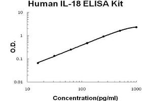 - human IL-18 ELISA Kit was based on standard sandwich enzyme-linked immune-sorbent assay technology. A monoclonal antibody from mouse specific for IL-18 has been precoated onto 96-well plates. Standards(E.coli, Y33-D197) and test samples are added to the wells, a biotinylated detection polyclonal antibody from goat specific for IL-18 is added subsequently and then followed by washing with PBS or TBS buffer. Avidin-Biotin-Peroxidase Complex was added and unbound conjugates were washed away with PBS or TBS buffer. HRP substrate TMB was used to visualize HRP enzymatic reaction. TMB was catalyzed by HRP to produce a blue color product that changed into yellow after adding acidic stop solution. The density of yellow is proportional to the human IL-18 amount of sample captured in plate.