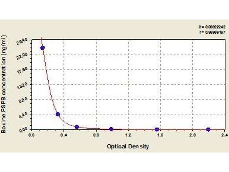 This assay employs the competitive enzyme immunoassay technique. The microtiter plate provided in this kit has been pre-coated with goat-anti-rabbit antibody. Standards or samples are added to the appropriate microtiter plate wells with an antibody specific for PSPB and Horseradish Peroxidase (HRP) conjugated PSPB. The competitive inhibition reaction is launched between with HRP labeled PSPB and unlabeled PSPB with the antibody. A substrate solution is added to the wells and the color develops in opposite to the amount of PSPB in the sample. The color development is stopped and the intensity of the color is measured.