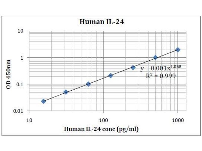 - This assay employs an antibody specific for Anti-humanIL-24 coated on a 96-well plate. Standards and samples are pipetted into the wells and IL-24 present in a sample is bound to the wells by the immobilized antibody. The wells are washed and biotinylated anti-humanIL-24 antibody is added. After washing away unbound biotinylated antibody, HRP-conjugated streptavidin is pipetted to the wells. The wells are again washed, a TMB substrate solution is added to the wells and color develops in proportion to the amount of IL-24 bound. The Stop Solution changes the color from blue to yellow, and the intensity of the color is measured at 450 nm.