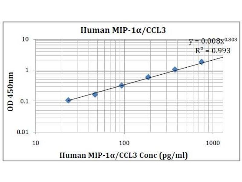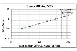 - This kit was based on sandwich enzyme-linked immune-sorbent assay technology. Anti- Human MIP-1Alpha /CCL3 antibody was pre-coated into 96-well plates. Biotin conjugated anti-human MIP-1Alpha /CCL3 detection antibody was used. Standards, test samples and biotin conjugated detection antibody were added to the wells subsequently. Wash buffer was used to wash any non-specific binding. HRP conjugated Streptavidin was used as secondary antibody. TMB substrates were used to visualize HRP enzymatic reaction. TMB was catalyzed by HRP to produce a blue color product that changed into yellow after adding acidic stop solution. The density of yellow is proportional to the Human MIP-1Alpha /CCL3 amount of samples captured in the plate. Optical Density (O.D) can be read at absorbance 450nm in a microplate reader. Concentration of Human MIP-1Alpha /CCL3 can be calculated using the standard curve.