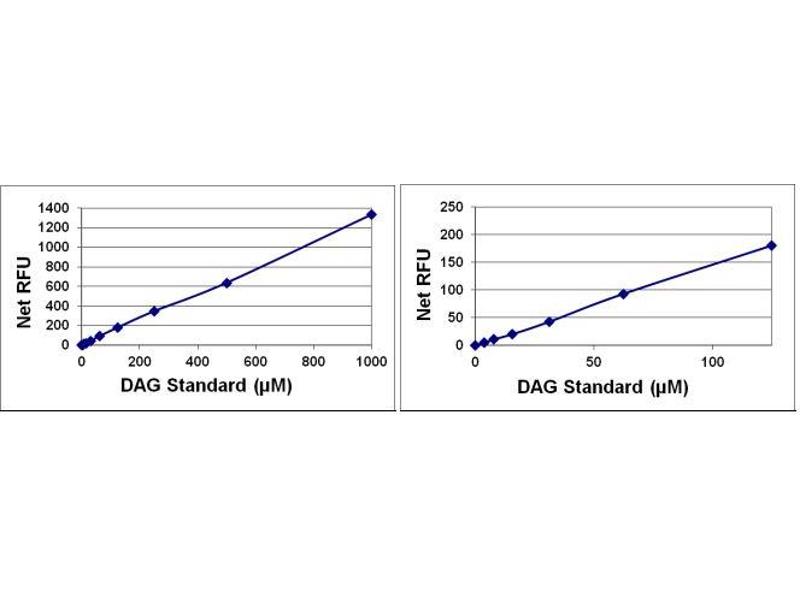 - DAG Assay Kit measures diacylglycerol content in samples by a coupled enzymatic reaction system. First, kinase is used to phosphorylate DAG samples, yielding phosphatidic acid. Next, a lipase is used to hydrolyze phosphatidic acid to glycerol-3-phosphate. Finally, the glycerol-3- phosphate product is oxidized by glycerol-3-phosphate oxidase (GPO), producing hydrogen peroxide which reacts with the kit's Fluorometric Probe (Ex. 530-560 nm/Em. 585-595 nm). The DAG Assay Kit is a simple, fluorometric assay that quantitatively measures total DAG (diacylglycerol) in cell lysates using a 96-well microtiter plate format. Each kit provides sufficient reagents to perform up to 100 assays*, including blanks, standards and unknown samples. The kit contains a DAG Standard and has a detection sensitivity limit of ~4 μM. *Note: Each sample replicate requires 2 assays, one treated with Kinase Mixture (+Kin) and one without (-Kin). DAG is calculated from the difference in fluorescence readings from the 2 wells.