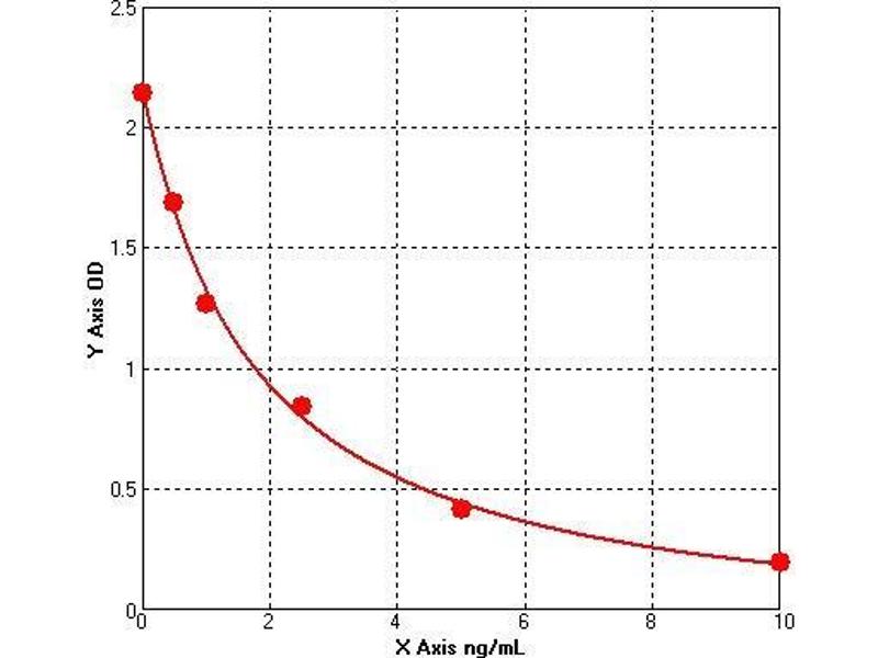 Prepare all Standards before starting assay procedure (Please read Reagents Preparation). It is recommended that all Standards and Samples be added in duplicate to the Microtiter Plate. 1. Secure the desired number of coated wells in the holder then add 50 µL of Standards or Samples to the appropriate well of the antibody pre-coated Microtiter Plate. 2. Add 50 μL of Conjugate to each well. Mix well. Complete mixing in this step is important. Cover and incubate for 1 hour at 37 °C. 3. Wash the Microtiter Plate using one of the specified methods indicated below: 4. Manual Washing: Remove incubation mixture by aspirating contents of the plate into a sink or proper waste container. Using a squirt bottle, fill each well completely with wash solution, then aspirate contents of the plate into a sink or proper waste container. Repeat this procedure four more times for a total of FIVE washes. After final wash, invert plate, and blot dry by hitting plate onto absorbent paper or paper towels until no moisture appears. Note: Hold the sides of the plate frame firmly hen washing the plate to assure that all strips remain securely in frame. 5. Automated Washing: Aspirate all wells, and then wash plate FIVE times using wash solution. Always adjust your washer to aspirate as much liquid as possible and set fill volume at 350 µL/well/wash (range: 350-400 µL). After final wash, invert plate, and blot dry by hitting plate onto absorbent paper or paper towels until no moisture appears. It is recommended that the washer be set for a soaking time of 10 seconds or shaking time of 5 seconds between washes. 6. Add 50 µL Substrate A to each well. 7.Add 50 µL Substrate B to each well. Cover and incubate for 15 minutes at 20-25 °C. (avoid sunlight) 8. Add 50 µL of Stop Solution to each well. Mix well. 9. Read the Optical Density (O.D.) at 450 nm using a microtiter plate reader immediately.