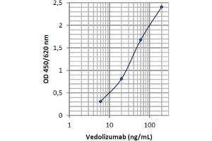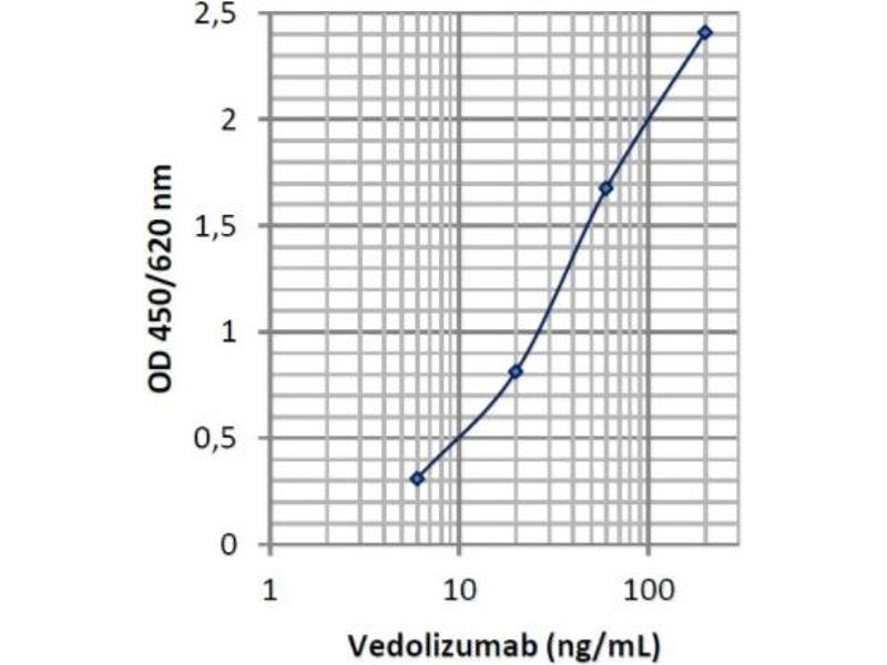 - There is no cross reaction with any other proteins present in native human serum. A screening test was performed with 24 different native human sera. All produced OD450/620 nm values (ranged from 0.097 to 0.166) less than the mean OD (0.311) of standard D (6 ng/mL). In addition, binding of Vedolizumab to the solid phase is inhibited by recombinant human 47 integrin protein in a concentration dependent manner. Therefore, the ImmunoGuide Vedolizumab ELISA (mAb-based) measures the biologically active free form of Vedolizumab, i.e. not pre-occupied by human 47 integrin antigen. No cross reaction was observed with sera spiked with the other therapeutic antibodies including Infliximab, Adalimumab, Etanercept, Bevacizumab, Cetuximab, Tocilizumab, Rituximab, and Nivolumab at concentrations up to 100 μg/mL. All produced mean OD450/620 nm values (ranged from 0.035 to 0.058) less than standard D.