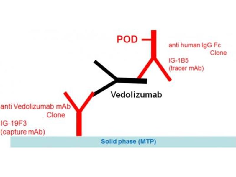 - This ELISA is based on a Vedolizumab-specific monoclonal antibody (catcher Ab clone19F3). Diluted standards and samples are incubated in the microtiter plate coated with mAb. After incubation, the wells are washed. A horseradish peroxidase (HRP)-conjugated anti-human IgG antibody is added and binds to the Fc part of Vedolizumab. Following incubation, wells are washed and the bound enzymatic activity is detected by addition of chromogen-substrate. The color developed is proportional to the amount of Vedolizumab in the sample or standard. Results of samples can be determined by using the standard curve.