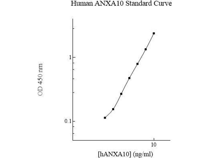 - Human Annexin A10 Microplate: A 96-well polystyrene microplate (12 strips of 8 wells) coated with a polyclonal antibody against human annexin A10. Sealing Tapes: Each kit contains 3 precut, pressure sensitive sealing tapes that can be cut to fit the format of the individual assay. Human Annexin A10 Standard: Human annexin A10 in a buffered protein base (6 ng, lyophilized). Biotinylated Human Annexin A10 Antibody (50x): A 50-fold biotinylated polyclonal antibody against human annexin A10 (120 l). MIX Diluent Concentrate (10x): A 10-fold concentrated buffered protein base (30 ml). Wash Buffer Concentrate (20x): A 20-fold concentrated buffered surfactant (30 ml, 2 bottles). Streptavidin-Peroxidase Conjugate (SP Conjugate): A 100-fold concentrate (80 l). Chromogen Substrate: A ready-to-use stabilized peroxidase chromogen substrate tetramethylbenzidine (8 ml). Stop Solution: A 0.5 N hydrochloric acid to stop the chromogen substrate reaction (12 ml).