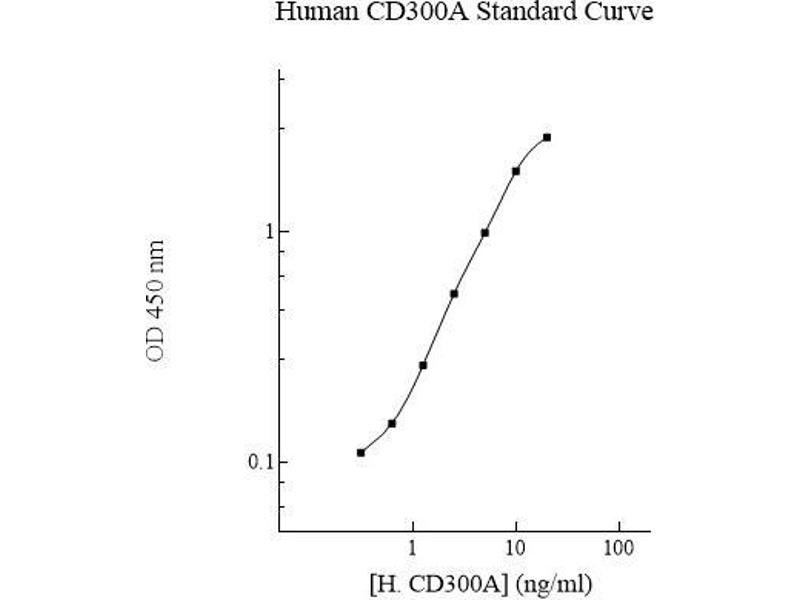 Prepare all reagents, standard solutions, and samples as instructed. Bring all reagents to room temperature before use. The assay is performed at room temperature (20-25 °C). Remove excess microplate strips from the plate frame and return them immediately to the foil pouch with desiccants inside. Reseal the pouch securely to minimize exposure to water vapor and store in a vacuum desiccator. Add 50 l of Human CD300A Standard or sample to each well. Gently tap plate to thoroughly coat the wells. Break any bubbles that may have formed. Cover wells with a sealing tape and incubate for 2 hours. Start the timer after the last addition. Wash five times with 200 l of Wash Buffer manually. Invert the plate each time and decant the contents, hit 4-5 times on absorbent material to completely remove the liquid. If using a machine, wash six times with 300 l of Wash Buffer and then invert the plate, decanting the contents, hit 4-5 times on absorbent material to completely remove the liquid. Add 50 l of Biotinylated Human CD300A Antibody to each well. Gently tap plate to thoroughly coat the wells. Break any bubbles that may have formed. Cover wells with a sealing tape and incubate for 1 hour. Wash the microplate as described above. Add 50 l of SP Conjugate to each well. Gently tap plate to thoroughly coat the wells. Break any bubbles that may have formed. Cover wells with a sealing tape and incubate for 30 minutes. Turn on the microplate reader and set up the program in advance. Wash the microplate as described above. Add 50 l of Chromogen Substrate to each well. Gently tap plate to thoroughly coat the wells. Break any bubbles that may have formed. Incubate for 15 minutes or until the optimal blue color density develops. Add 50 l of Stop Solution to each well. The color will change from blue to yellow. Gently tap plate to ensure thorough mixing. Break any bubbles that may have formed. Read the absorbance on a microplate reader at a wavelength of 450 nm immediately. If wavelength correction is available, subtract readings at 570 nm from those at 450 nm to correct optical imperfections. Otherwise, read the plate at 450 nm only. Please note that some unstable black particles may be generated at high concentration points after stopping the reaction for about 10 minutes, which will reduce the readings. 6