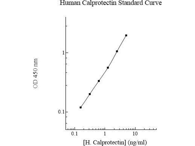 Human Calprotectin Microplate: A 96-well polystyrene microplate (12 strips of 8 wells) coated with a polyclonal antibody against human calprotectin. Sealing Tapes: Each kit contains 3 precut, pressure sensitive sealing tapes that can be cut to fit the format of the individual assay. Human Calprotectin Standard: Human calprotectin in a buffered protein base (5 ng, lyophilized). Biotinylated Human Calprotectin Antibody (50x): A 50-fold concentrated biotinylated polyclonal antibody against human calprotectin (120 l). MIX Diluent Concentrate (10x): A 10-fold concentrated buffered protein base (30 ml). Wash Buffer Concentrate (20x): A 20-fold concentrated buffered surfactant (30 ml, 2 bottles). SP Conjugate (100x): A 100-fold concentrate (80 l). Chromogen Substrate (1x): A stabilized peroxidase chromogen substrate tetramethylbenzidine (8 ml). Stop Solution (1x): A 0.5 N hydrochloric acid solution to stop the chromogen substrate reaction (12 ml).