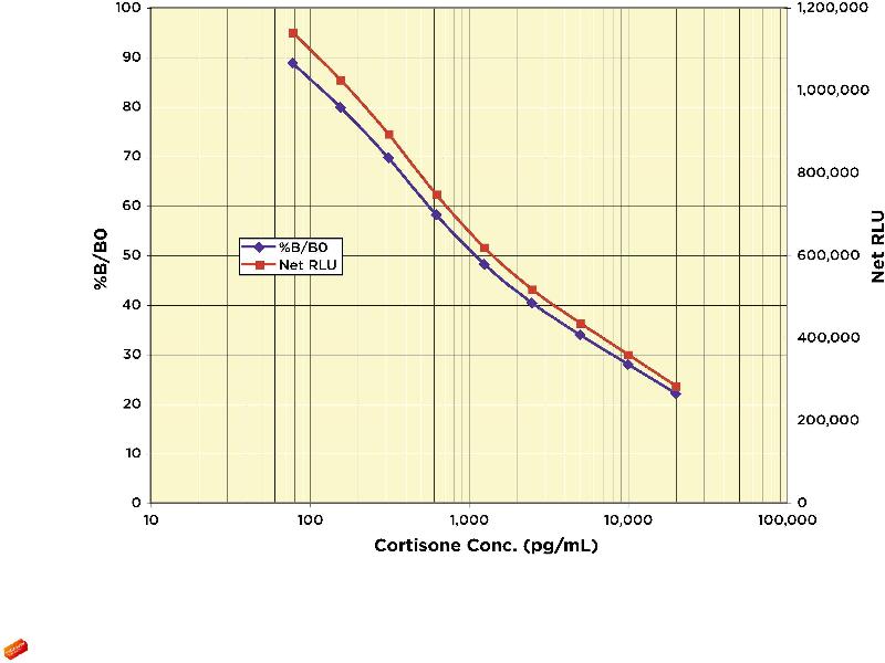9. Add 100 μL of the mixed Chemiluminescent Substrate to each well, using a repeater pipet. 10. Incubate the plate at room temperature for 5 minutes without shaking. 11. Read the luminescence generated from each well in a mutimode or chemiluminescent plate reader using a 0.1 second read time per well. The chemiluminescent signal will decrease about 40 % over 60 minutes. 12. Use the plate reader's built-in 4PLC software capabilities to calculate Cortisone concentration for each sample.