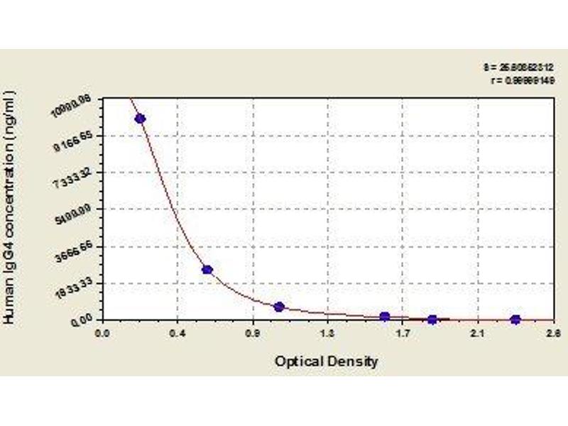 Create a standard curve by reducing the data using computer software capable of generating a four parameter logistic (4-PL) curve fit. As an alternative, construct a standard curve by plotting the mean absorbance for each standard on the x-axis against the concentration on the y-axis and draw a best fit curve through the points on the graph. The data may be linearized by plotting the log of the target antigen concentration versus the log of the O.D. and the best fit line can be determined by regression analysis. This procedure will produce an adequate but less precise fit of the data.