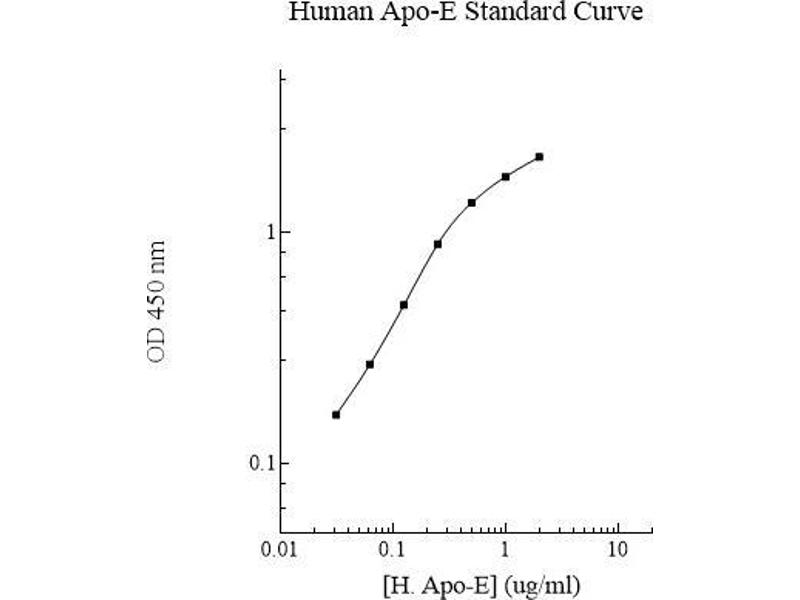 Prepare all reagents, working standards and samples as instructed. Bring all reagents to room temperature before use. The assay is performed at room temperature (20 - 30 °C). Remove excess microplate strips from the plate frame and return them immediately to the foil pouch with desiccant inside. Reseal the pouch securely to minimize exposure to water vapor and store in a vacuum desiccator. Add 50 µL of Apo E standard or sample per well. Cover wells with a sealing tape and incubate for two hours. Start the timer after the last sample addition. Wash five times with 200 µL of Wash Buffer manually. Invert the plate each time and decant the contents, hit it 4-5 times on absorbent paper towel to completely remove the liquid. If using a machine wash six times with 300 µL of Wash Buffer and then invert the plate, decant the contents, hit it 4-5 times on absorbent paper towel to completely remove the liquid. Add 50 µL of Biotinylated Apo E Antibody to each well and incubate for one hour. Wash a microplate as described above. Add 50 µL of Streptavidin-Peroxidase Conjugate to each well and incubate for 30 minutes. Turn on the microplate reader and set up the program in advance. 3 Wash a microplate as described above. Add 50 µL of Chromogen Substrate per well and incubate for about 20 minutes or till the optimal blue color density develops. Gently tap plate to ensure thorough mixing and break the bubbles in the well with pipette tip. Add 50 µL of Stop Solution to each well. The color will change from blue to yellow. Read the absorbance on a microplate reader at a wavelength of 450 nm immediately. If wavelength correction is available, subtract readings at 570 nm from those at 450 nm to correct optical imperfections. Otherwise, read the plate at 450 nm only. Please note that some unstable black particles may be generated at high concentration points after stopping the reaction for about 10 minutes, which will reduce the readings.