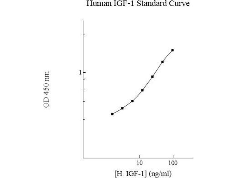 Prepare all reagents, working standards and samples as instructed. Bring all reagents to room temperature before use. The assay is performed at room temperature (20 - 30 °C). Remove excess microplate strips from the plate frame and return them immediately to the foil pouch with desiccant inside. Reseal the pouch securely to minimize exposure to water vapor and store in a vacuum desiccator. Add 50 µL of Standard or sample per well, and cover wells and incubate for two hours. Start the timer after the last sample addition. Wash five times with 200 µL of Wash Buffer manually. Invert the plate each time and decant the contents, hit it 4-5 times on absorbent paper towel to completely remove the liquid. Add 50 µL of Biotinylated IGF-1 Antibody to each well and incubate for two hours. Wash a microplate as described above. Add 50 µL of Streptavidin-Peroxidase Conjugate per well and incubate for 30 minutes. Turn on the microplate reader and set up the program in advance. Wash a microplate as described above. Add 50 µL of Chromogen Substrate per well and incubate for about 10 minutes or till the optimal blue color density develops. Gently tap plate to ensure thorough mixing and break the bubbles in the well with pipette tip. Add 50 µL of Stop Solution to each well. The color will change from blue to yellow. Read the absorbance on a microplate reader at a wavelength of 450 nm immediately. If wavelength correction is available, subtract readings at 570 nm from those at 450 nm to correct optical imperfections. Otherwise, read the plate at 450 nm only. Please note that some unstable black 3 particles may be generated at high concentration points after stopping the reaction for about 10 minutes, which will reduce the readings.
