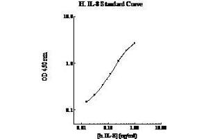 Prepare all reagents, working standards and samples as instructed. Bring all reagents to room temperature before use. The assay is performed at room temperature (20 - 30 °C). Remove excess microplate strips from the plate frame and return them immediately to the foil pouch with desiccant inside. Reseal the pouch securely to minimize exposure to water vapor and store in a vacuum desiccator. Add 50 µL of Standard or sample per well. Cover wells with a sealing tape and incubate for two hours. Start the timer after the last sample addition. Wash five times with 200 µL of Wash Buffer. Invert the plate and decant the contents, and hit it 4-5 times on absorbent paper towel to complete remove liquid at each step. Add 50 µL of Biotinylated IL-8 Antibody to each well and incubate for two hours. Wash five times with 200 µL of Wash Buffer as above. Add 50 µL of Streptavidin-Peroxidase Conjugate per well and incubate for 30 minutes. Turn on the microplate reader and set up the program in advance. Wash five times with 200 µL of Wash Buffer as above. Add 50 µL of Chromogen Substrate per well and incubate for approximately 7 minutes or till the optimal blue color density develops. Gently tap the plate to ensure thorough mixing and break the bubbles in the well with pipette tip. Add 50 µL of Stop Solution to each well. The color will change from blue to yellow. Read the absorbance on a microplate reader at a wavelength of 450 nm immediately.