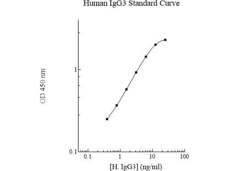 - Human IgG3 Microplate: A 96-well polystyrene microplate (12 strips of 8 wells) coated with a polyclonal antibody against human IgG3. Sealing Tapes: Each kit contains 3 pre-cut, pressure-sensitive sealing tapes that can be cut to fit the format of the individual assay. 1 Human IgG3 Standard: Human IgG3 in a buffered protein base (50 ng, lyophilized). Biotinylated IgG3 Antibody (50x): A 50-fold concentrated biotinylated polyclonal antibody against IgG3 (140µl). MIx Diluent Concentrate (10x): A 10-fold concentrated buffered protein base (30 ml). Wash Buffer Concentrate (20x): A 20-fold concentrated buffered surfactant (30 ml, 2 bottles). Streptavidin-Peroxidase Conjugate (SP Conjugate): A 100-fold concentrate (80µl). Chromogen Substrate: A ready-to-use stabilized peroxidase chromogen substrate tetramethylbenzidine (8 ml). Stop Solution: A 0.5 N hydrochloric acid to stop the chromogen substrate reaction (12 ml).